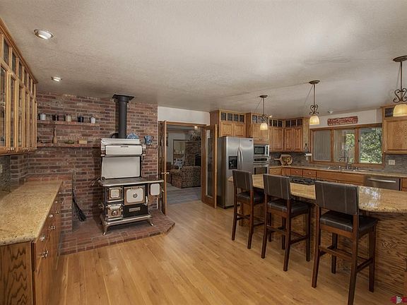 Just minutes from town nestled along a tree lined seasonal creek, this secluded 42 acre property that shares a border with public land is rural living at its finest. This is the spectacular personal home of a elite custom builder. This property includes the original homestead cabin and cistern. Numerous fruit and flowering trees, plenty of irrigation water, custom built chicken coop and your choice of garden areas. The minute you walk into this home you can seethe craftsmanship throughout this custom designed home. Host guests in the beautifully designed kitchen with solid oak flooring,custom built oak cabinets, updated appliances and a large walk-in pantry. This home offers more storage than you can fill. Cozy up to the massive freestanding rock gas fireplace or back up to one of two wood stoves including a " Heartland Sweetheart" wood cook stove in the kitchen area. Retire to the spacious master bedroom with walk -in closet, soaking tub, large walk-in shower and gas fireplace. A large kitchen/family room opens up to an informal dining room. This home is perfect for large gatherings of family and friends. Head down to the basement to a recreation room, TV room, a 3/4 bathroom and numerous storage rooms. Then outside to barbeque, play or just relax and enjoy the large shaded patio or second covered patio. The property that this home sits on is your own Garden of Eden with its lush grass,flower beds, fruit and flowering trees, pond and beautiful tree lined creek running through the backyard. Also included with this magnificent property is a 1500 sq ft home. Perfect for guests, multi/generational living, or income property.