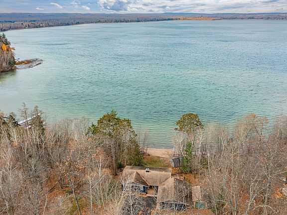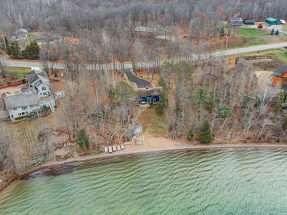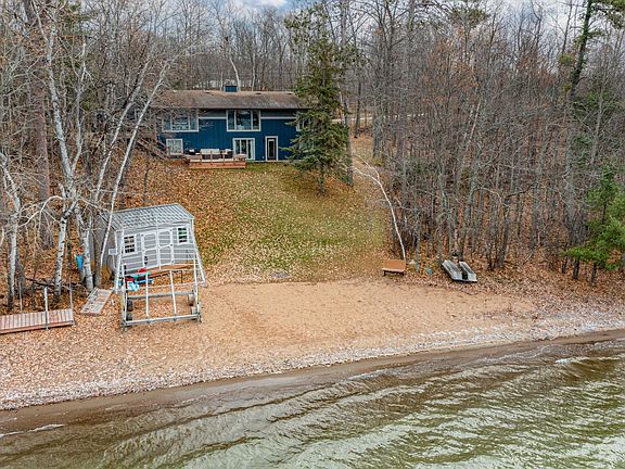 Serenity on Sugar (Siseebakwet) Lake with 237 feet of west-facing shoreline. From the moment you walk-in, you’ll admire panoramic views of the glistening water through the new Anderson 400 series windows. The open concept offers modern updates with custom cabinetry, quartz countertops, and elegant tile backsplash. New flooring leads into the living room where you’ll find an ideal space to take in the stunning sunsets while staying cozy by the fireplace. The lakeside bedroom is spacious and boasts modern built-ins. An additional bedroom, updated full bath, bonus room with its own mini-split for heating/cooling, and laundry room complete the main level. The lower walkout hosts a family room, two bedrooms facing the lake, renovated 0.75 bath, and storage space. You’ll appreciate the endless mechanical and aesthetic updates, along with the iconic sand beach and aquamarine water creating your own private oasis. This property is a true show-stopper.