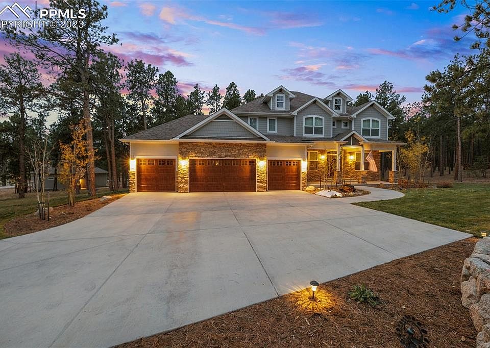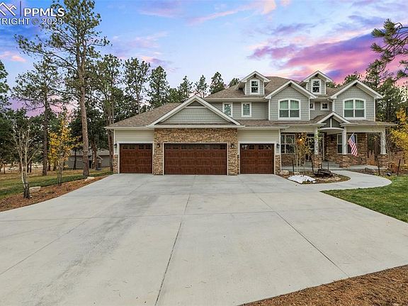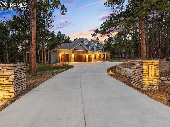 Mountain-living serenity abounds in this modern custom home nestled in the foothills of this quiet Monument, Colorado community. Professionally irrigated lawn on 2.5 treed acres on a corner lot with water features and covered porch that add to its already cozy and tranquil feel. Wood floors are prevalent throughout the main living-level, which includes an office, formal dining area, living space, gourmet kitchen, southeast facing sunroom, and mud room off of the heated attached 4-car garage. Kitchen walks out to an oversized composite deck where you can enjoy technicolor sunsets with your favorite beverage, which also includes an installed gas line for your fire pit or grill. On the upper level are four bedrooms, each with their own walk-in closet and bathroom access. The owner's retreat features a chandelier-adorned sitting area, dual-sided gas fireplace and cabinets, resting space, and an opulent 6-piece bath with heated flooring, walk-in spa shower and modern freestanding soaking tub. Upper-level laundry space has ample cabinet, counter space and sink. The fully-finished and spacious garden-level basement has wet bar with bar seating and pendant lighting, and multiple living spaces (to include a fun hidden play space under the stairs!). French doors lead you into the fifth bedroom with walk-in closet, and the full bathroom is beautifully tiled and bright. Let's not forget the additional parking for 4 vehicles in the recently-built detached garage with garage and door access. Location affords ideal access to shopping, recreation, dining and business corridors in both Colorado Springs and Denver!