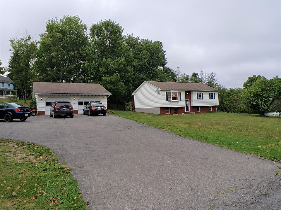 Move right into this 3 bedroom, 1 bath split level on over 2 acres with a detached 2 car garage and a large paved parking lot. Nice private back deck . Eat in kitchen with a sliding glass door to the back deck perfect for entertaining. Nicely sized living room with a large window to let in the natural lighting.