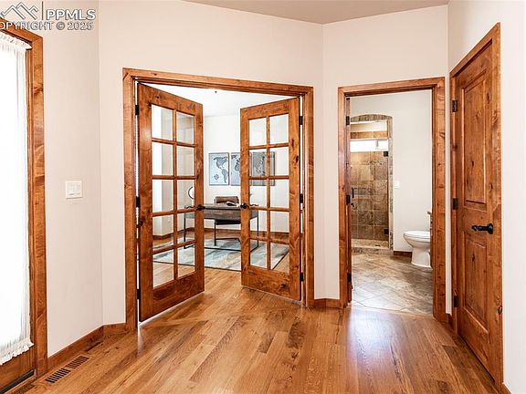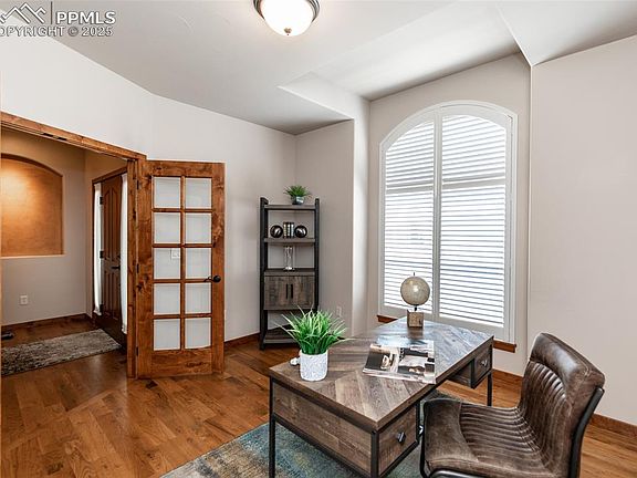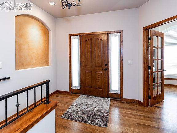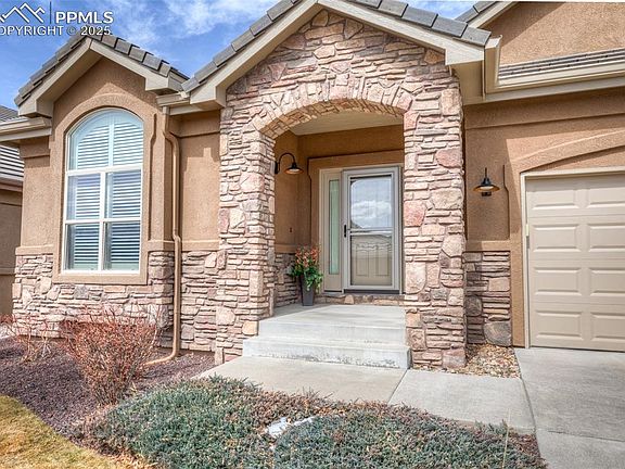 Exquisite Ranch-Style Home in Coveted D20 School District Welcome to this beautifully appointed former model home, located in a quiet cul-de-sac, desirable neighborhood with top-rated schools and easy access to I-25, Chapel Hills Mall, restaurants, and USAFA. From the moment you step inside, you'll be captivated by the open floor plan, abundant natural light, vaulted ceilings, rich new hardwood flooring throughout the main living areas, office, and primary suite. Custom features include hand-troweled walls, knotty alder doors, trim, and cabinetry, and plantation shutters that add warmth and elegance to every room. The spacious living room centers around a cozy gas fireplace, while the dedicated office boasts views of Pikes Peak. The gourmet kitchen is a chef’s dream, complete with granite countertops, stylish backsplash, under-cabinet lighting, stainless-steel appliances, gas cooktop, double ovens, and large pantry. Step outside to your private backyard oasis—perfect for entertaining—with a covered Trex deck and a large patio. Retreat to the luxurious main-floor primary suite, which features vaulted ceilings, a spa-like five-piece bath with radiant heated tile floors, instant hot water, upgraded tilework, and a generous walk-in closet. The laundry room is thoughtfully placed nearby with upper cabinetry and a utility sink. The finished basement offers a spacious family room with 9-foot ceilings, a granite wet bar with a mini fridge, two additional bedrooms (one non-conforming), a full bath with radiant heated flooring, and ample storage space that could be converted into a fourth bedroom. Additional highlights include: Oversized finished 2-car garage with room for a truck and SUV, Concrete tile roof with 50-year life expectancy, In-wall home theater speaker wiring, Southern-facing driveway, Professionally landscaped yard maintained by the HOA This home truly has it all—style, space, location, and luxury. Don’t miss the opportunity to make it yours.