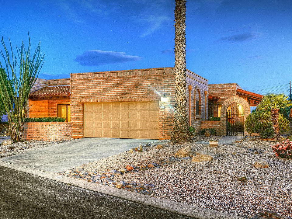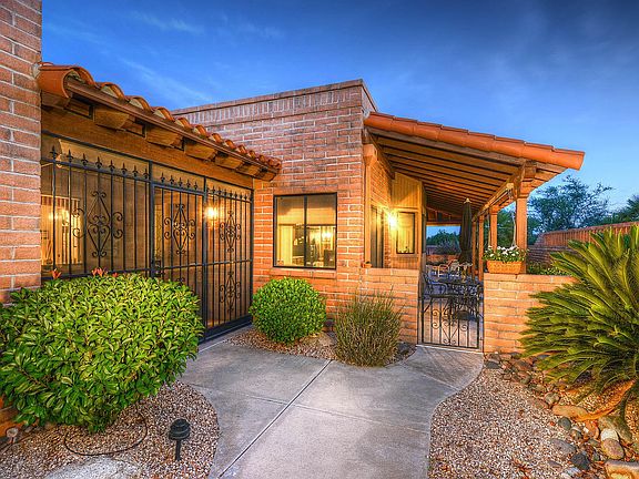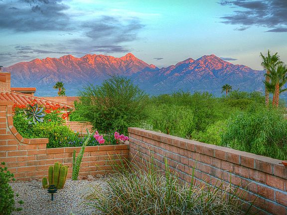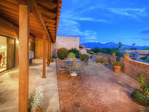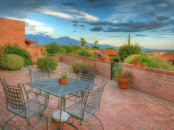 Gorgeous views from the bricked wrap-around patio of this very special home! 2050 sq ft consists of 2 bed/2 bath + den. Warm tile flows from the elegant entry throughout most of the living areas. The spacious living room will welcome guests with its custom gas fireplace and sliders letting in all of the natural light. The spacious and bright dining area is adjacent to the living room & looks out onto those spectacular Santa Rita Mountains! The updated kitchen showcases custom maple cabinets with soft close doors & pullouts. The den has a wall of built ins for art display or office and craft work, and is large enough to double as a third guest room.The master suite is luxurious with sliders leading to the patio, a huge garden tub, double vanities and walk in close The guest suite offers privacy and comfort with its own patio and peaceful garden area.This home is truly your oasis in the desert!