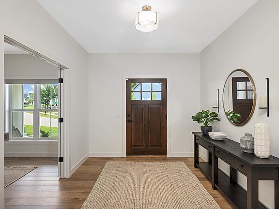 Upgrades abound throughout the home, including an oversized kitchen island with Cambria quartz countertops, a gourmet kitchen with high-end appliances, a built-in buffet, and a beverage center in the dining area. The living room features custom built-ins, and the home offers two-zone heating and cooling with individual thermostats. Additional highlights include a main-level bedroom, solid core doors, site-finished enameled millwork, and rough-ins for a future basement bar and lower-level family room fireplace.