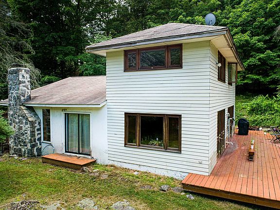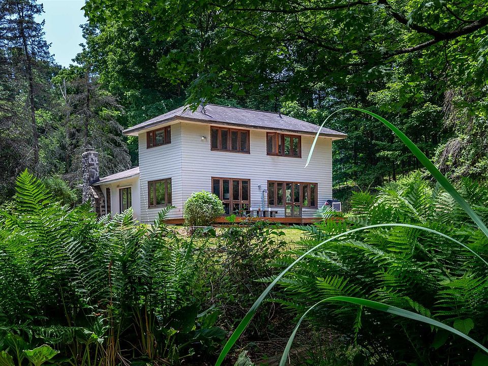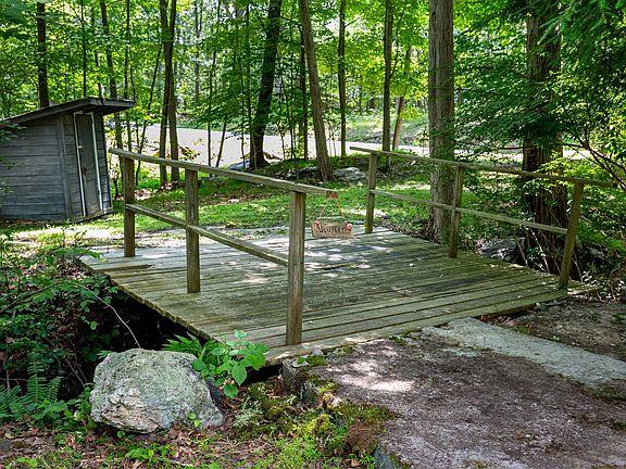 Just below the crest of Bundy Hill is a special quiet setting with meandering paths, a brook and bridge and a wonderfully unique contemporary home. Enter to a living room with a stone fireplace with insert. Through French doors is a den/office with views over the front patio. Beyond the first floor bedroom & full bath is the huge great room with a high ceiling and windows on three sides and glass doors that open to the 500 SF deck. Wood beams and hardwood floors add to to the comfortable feeling of the space. Room for a formal dining set conveniently placed next to the bright kitchen. The newly renovated kitchen is designed for ease with style. Lots of cabinet space, a black marble countertop opposite a long butcher block. An open staircase leads from the great room to a master suite wide as the home, it's huge! Bonus on the second floor is the easy access to storage in the partial attic. All this minutes away from the quaint village of Pawling and easy access to Metro North.