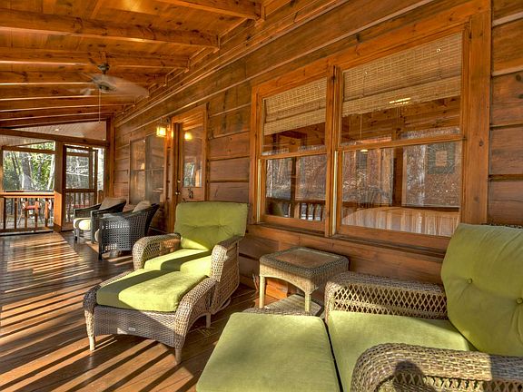 This is a beautiful 3BR/3BA PLUS loft, gated GCreekfrontG cabin with all the upgrades including granite throughout, stainless appliances, walk-in shower. Beautiful forest setting with great privacy with all paved roads. There are 2 Bedrooms on the main floor including the master and laundry, AND a finished teen/guest retreat on the terrace level. Large loft, vaulted ceilings, all wood interior and a floor to ceiling, wood burning fireplace that currently has gas logs. Outside you will find covered and open porches, a screened porch, storage shed,, and carport. Gentle, easy access to the creek too! Would be a very successful rental. Fully furnished and move in ready.