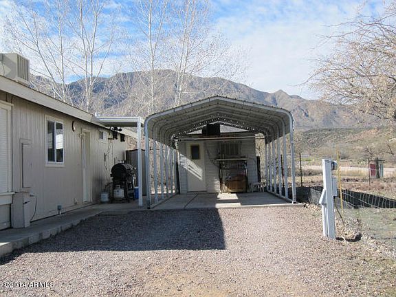 Recent price reduction! LOOKING for privacy, charm & views? Semi-custom 2002 mnf'd. home, 2BR/2BA/Den w/enclosed front patio, on 0.54 fenced acres; Covered rear patio w/gorgeous views of Four Peaks & Picture Mountain! Open floor plan; breakfast bar; double door refrigerator w/ice maker; electric smooth top range; pantry w/roll out shelves; NEW Lennox A/C unit w/gas pack; (4) metal carports with one 15' tall; (2) RV parking areas with hook ups/dump; (10X20) industrial quality garage/shed; (2) additional (10X10) sheds; Two mature Cottonwood trees! FHA Tie Downs for ease in financing! Horse shoe pit & fire pit. Easy Lock and Leave in Tonto Basin! Only 8 miles to beautiful Lake Roosevelt!