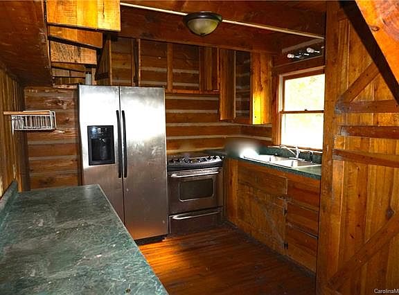 Great time to make an offer: Rustic Log Cabin Retreat with cascading mountain stream flowing along border; simple, earthy and unpretentious;, evocative of the earthiest of Mother Nature's masterpieces, Huge Living Room with cozy woodstove; Master bath with tiled walk-in shower; design emphasis on rugged with solid wood doors, open exposed beams, and stone hearth; Master and laundry on main level; Huge 2-story multi-use out building; easy access from state paved road; short distance to Crabtree Creek trout stream and downtown Spruce Pine; Easy access; Vacant - Show anytime