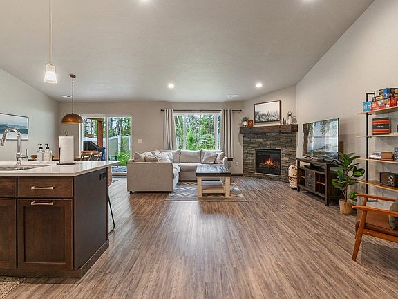 Welcome to your new home in the charming neighborhood of The Retreat at the Bay Trail! Built in 2021, this residence offers 3 bedrooms, 2 bathrooms, and airy vaulted ceilings that create an inviting atmosphere. The open floor plan seamlessly connects the living area to the kitchen, featuring a large island, quartz countertops, a spacious pantry, and a gas range- perfect for entertaining or everyday living. Step through the sliding glass door onto the covered back patio, extending your living space outdoors. Outside, the fenced backyard presents a canvas for your imagination, adorned with native plants and trees. Whether you prefer a natural oasis or a landscaped retreat, the choice is yours to make. Situated just off the Elks Golf Course, this home offers unparalleled convenience. Explore the neighborhood's scenic paths and find yourself at the shores of Lake Pend Oreille on the Bay Trail in a mere 15 minutes. The furniture is negotiable, so it's truly move in ready!