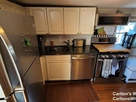 Available Oct 1st. Top floor renovated 1 bedroom apartment located in Jeffries Point neighborhood of East Boston. This 4th floor, 500 sqft unit features hardwood floors throughout, modern kitchen with SS appliances and granite counters, new tiled bathroom, narrow open kitchen/living/area, large bedroom that fits king size bed, shared roof deck with city views, gas heating, coin-op laundry in basement. Location is 2/3 blocks away from the Maverick T Blue line stop, close to waterfront, restaurants, Greenway and parks. Pets negotiable. Single renters preferred. Garage parking available for additional amount. Tenant pays gas and electricity. First, security and 1 month broker fee to move in.