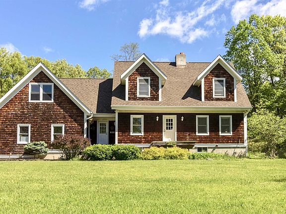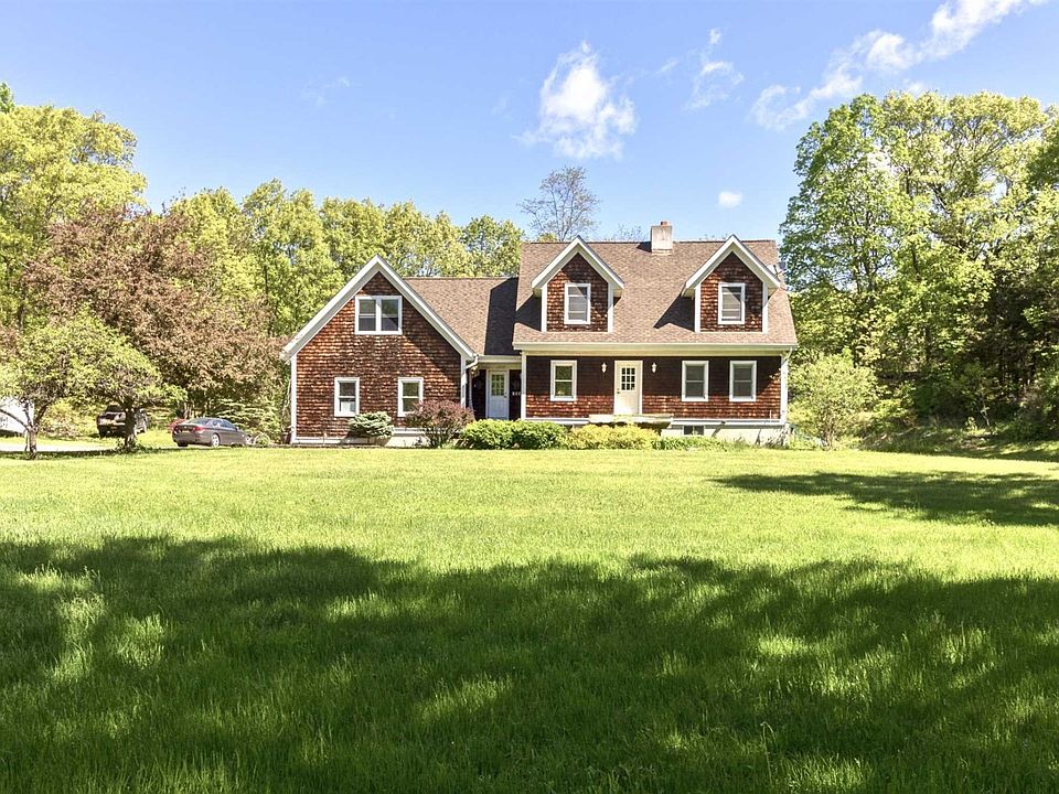 Set comfortably back from the road, and with a wonderful sense of privacy, this handsome Cape Cod design has a striking appearance with wood shake siding, steep roof pitch and depth created by oversized dormers and extended eaves. Set on nearly 7 acres on a country lane and buffered by woodland, the location will work well as a full-time residence or a part-time country escape. Wide-board wood floors run throughout this comfortable 3-bedroom, 3-bath design. The welcoming country kitchen has plenty of storage and prep space, with stainless appliances, an eat-in dinette, stone fireplace and sliders to an expansive stone patio. Don't feel like cooking inside on a gorgeous day? Dine outside and cook homemade pizza in the custom brick oven! Completing the main level is a formal dining room, living room with lovely brick fireplace, den and full bath with laundry. The second level consists of a spacious master bedroom with private bath, 2 additional large bedrooms, hall bath and very large bonus room/office above the 2-bay garage. The full, unfinished basement is studded out and ready for expansion needs, has a separate mechanical room and also includes a fantastic custom wine cellar. Open lawn, specimen trees, stone walls and garden beds accentuate the very pretty landscape. Convenient access to the Taconic Pkwy and the villages of Rhinebeck and Millbrook.