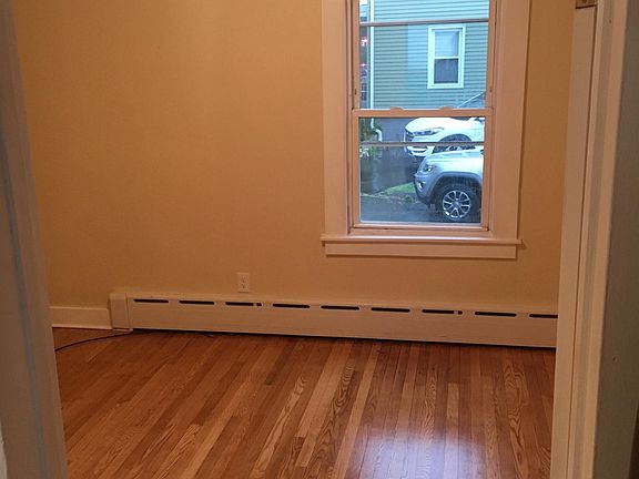 First floor one bedroom unit completely redone. Own entrance separated from second unit. Small porch in front. Oil baseboard heat (oil included in rent). Metered water and electric. Unit has own driveway for off street parking, shared washer and dryer in basement or additional hook up also in basement. New stainless steel fridge, range, and dishwasher. Granite countertops and wood floors. One car garage available for storage. Small backyard. Heat included in rent