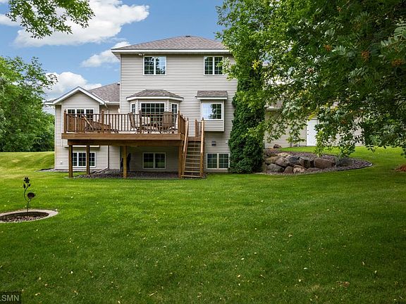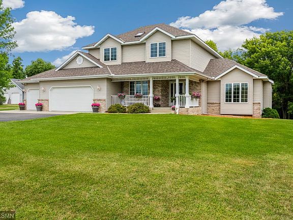 Incredible property, first time available! Situated on the hilltop with views of Maple Lake from this beautifully maintained two-story with 45x30 pole shed. Lovely front porch & large deck off the back! 4 bedrooms on one level, expansive master with private full bath & walk-in closet, open floor plan, main level laundry, two gas fireplaces, LL wet-bar, newer mechanicals & roof, over-sized heated & insulated garage, in-ground sprinkler. Sprawling and nature-filled 9.7 acres with trails and ponds!