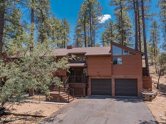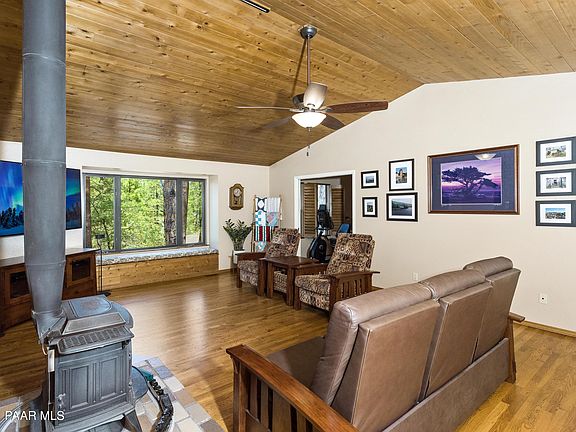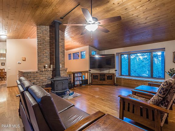 Located in a supremely serene setting that backs up to national forest, this home boasts great architectural appeal plus a recently remodeled gourmet kitchen, master bathroom & powder bathroom! The incredible forest location can be enjoyed on either of the recently renovated front/rear Trex decks and downtown Prescott & historic Whiskey Row are just minutes away!The interior features include floor-to-ceiling windows for abundant natural light, outstanding forest views, soaring vaulted T/G ceiling, ceiling fans throughout, extensive upper-level hardwood flooring, a charming wood burning stove, wood/brick accents throughout, recessed lighting & wood/quartz window sills.The massive open kitchen would satisfy any chef, has Thumb Butte views, and is equipped with refinished CONTINUED...