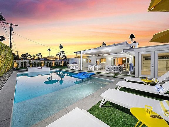 Mid-Century Modern beauty! Outstanding curb appeal, incredible yard with mountain views, updated interior & a great price. What more could you want? How about - towering trees and a manicured lawn leading to the inviting entry complete with a beautiful stained glass window. And upon entering, the charm of this home continues with vaulted beamed ceilings, picturesque front windows to mountain views as well as celestory windows, cozy fireplace open to both living and dining areas, attractive tile flooring & French doors to the patio. The updated kitchen offers corian counters, newer appliances including wine cooler, an appliance garage, track lighting and breakfast counter. Both baths have been updated as well. The backyard is perfect for entertaining with the large alumawood-covered patio, sparkling pool, spa, beautiful fountain, incredible views & abundant fruit trees (including peach). There is central A/C, evap cooling, a 2-car garage plus convenient RV storage (with h