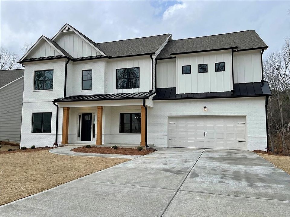 New Construction 2 story Floor on BASEMENT featuring a 3 (TANDEM) car garage: Farmhouse style home - 5 bedrooms, 4.5 baths, Loft Up, Guest Suite on Main. This home is large & has tons of upgrades: Impressive flooring; stained stairs and wrought iron railing; luxurious tile in every bath and laundry; low maintenance hardwood-inspired EVP flooring in the majority of the main level: foyer, dining, study, halls on main, great room, kitchen, pantry and breakfast, formal dining, home office, great room with coffered ceiling, breakfast area, island & all white gourmet kitchen. Gourmet kitchen with 5 burner gas cooktops, wall oven, tile backsplash, Quartz countertops, stainless steel appliances, CUSTOM GRAY ISLAND, bright white kitchen cabinetry with black matte pulls, large center island, bar stool seating, under cabinet lighting, additional LED ceiling lights, walk-in pantry, and large gooseneck faucet. Enjoy outdoor living with the oversized covered rear porch. CUSTOM all tile shower in Primary Bath with large garden tub and granite vanities. Smart front door lock, LED floodlights, remote control garage door opener, and more. It is located in a quaint new community with only 44 homesites and is just minutes from the south end of Lake Lanier. This community is close to shopping/dining AND all the lake offers. We can close this home in 30 days or less! GET $8500 ANYWAY YOU WANT AND $1500 TOWARDS CLOSING COST WHEN YOU USE OUR PREFERRED LENDER and CLOSE IN 60 DAYS OR LESS!!