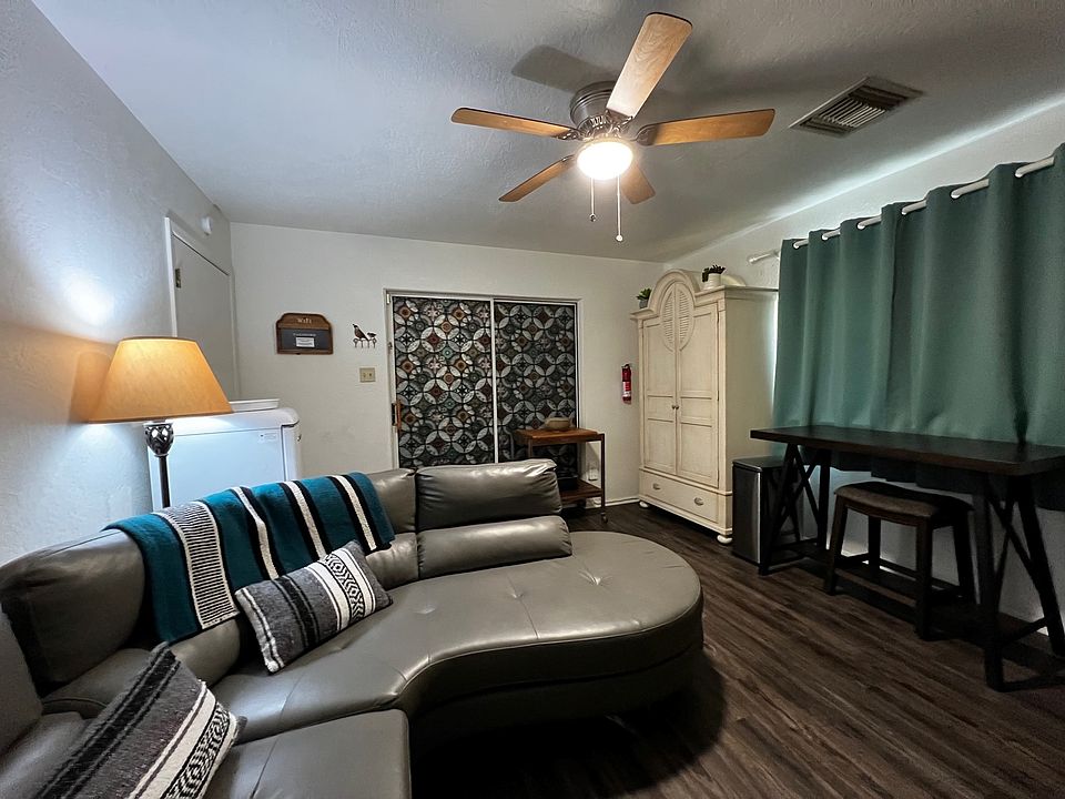 The Sweet Casita is a FULLY FURNISHED guesthouse on a CORNER LOT with a PRIVATE DRIVEWAY. Short-term lease available with a 3-month minimum. ALL UTILITIES AND WI-FI INCLUDED. This charming guesthouse is centrally located and within minutes of historic downtown Yuma, Colorado River and Wetlands, airport, hospital, shopping, churches, and California and Mexico. Kitchenette includes small refrigerator/freezer, microwave, toaster, electric skillet and coffee maker with starter supplies of coffee and kitchen essentials. The bathroom is spacious and comes with quality towels, hand towels, wash cloths, and includes starter toiletries. The bedroom includes a king-size bed, wardrobe, nightstands, dresser and quality bedding and linens. PLEASE NOTE: - Maximum occupancy: 2 - All utilities and Wi-Fi included. Please use AC efficiently and do not lower below 74 degrees to avoid a surcharge. - $150 for move-out cleaning. - Guest must sign a Rental Agreement and provide an image of a valid picture ID. - Minimum age requirement to book is 25 years. - No parties or events allowed. - No smoking, vaping, or candles inside the home. Smoking is permitted outside. - No pets allowed. - Parking is available on private driveway (large enough for an RV). Street parking is also available. AMENITIES: - 45-inch TV - Small refrigerator with freezer - Toaster - Microwave - Electric skillet - 5-cup coffee maker (with starter supplies) - Outdoor BBQ grill - Dishes, silverware and kitchen essentials - Bedding and towels provided - Bathroom essentials (starter supplies) - Blow dryer - Cleaning essentials - Iron - Dedicated work area (desk with rolling office chair) - Computer monitor available upon request Does not include washer/dryer. There is a laundromat nearby. Water, electric, and internet included.