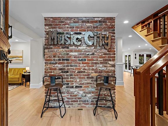 Striking brick fireplaceBeamed ceilingsTranquil water featureStylish half bathTerrace-level deckCustom built-insAiry open-concept floor plan