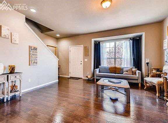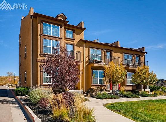 This towering Brownstone is perfectly positioned to enjoy all the splendor of Pikes Peak. The views are breathtaking! Nothing really compares. You must see to appreciate. The main level opens to your living room, and living spaces. Upstairs are 3 bedrooms including the master suite with dual closets and a private balcony to soak in the sun and wake up to that VIEW! The large finished basement offers another room with full bath. This is an end unit and one of only three like it. 12'' gap between walls.