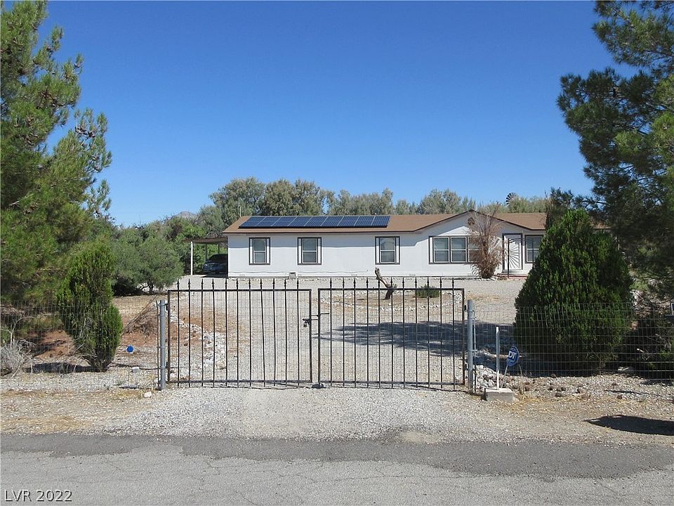 Nestled in the heart of Pahrump Valley, this property hits all the right notes. Acre lot offers a mesquite forest, complete with walking paths. Mondale Pines and sea greens. In back is a large covered patio with a detached gazebo. The carport is attached at side entry off the laundry room. Entire property is rocked for dust control. The home has a formal living room flowing into the dining room both with laminate flooring. Chef's dream kitchen has ample cabinets, built-in hutch, large island and breakfast area with slider to the patio. The kitchen is open to a separate large family room featuring a TV alcove and fireplace. Primary suite is on the opposite end of the home from the other bedrooms and includes a sitting area and a large skylit en suite 5 piece bath with his and her vanities. In addition to the other 2 large bedrooms, there is a den with a closet that could be a 4th bedroom. Solar panels provide power for $126/mo for all elec home plus well. NO HOA and not in a flood zone!