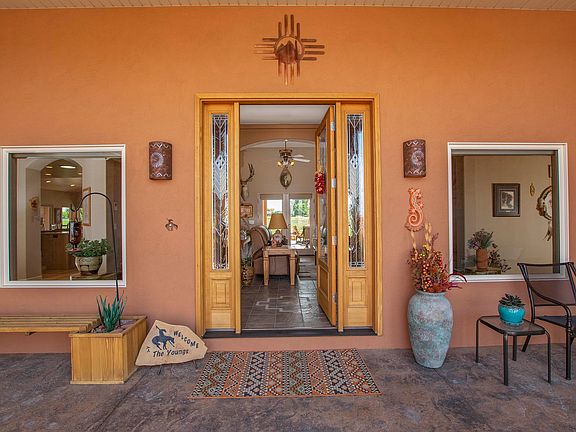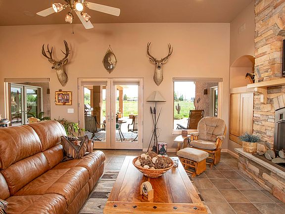 Stunning, immaculate 3257sf, 4 bedroom, 2.5 bath home minutes south of Montrose on 5+ irrigated acres with San Juan and surrounding views. Upscale Southwestern style with attention to every detail and superbly maintained. Gated courtyard and covered back patio with over 1000sf of outdoor living space. Inviting formal living with archways, stone gas fireplace and French doors to southern facing patio. Split floor plan with elegant private master with coffered ceiling, charming wall sconces, and patio entrance. Master en suite with walk-in shower, jetted tub, double sinks and two closets. On the opposite side of home, two guest bedrooms share a Jack and Jill bath. A 4th bedroom, near the master, makes for a nice office. Beautiful kitchen opens to dining area and family room with Kiva fireplace and windows galore providing abundance of natural light and exposing the beautiful surrounding views. Expansive island/bar, Corian countertops, JennAir double oven and refrigerator, Viking cook top, under-counter and above-cabinet lighting, pantry cabinets with pull out drawers with electrical outlets to tuck away small appliances, built in desk area, coppered colored faucet and cabinet handles. Immaculate yard with sprinkler system. Irrigated pasture with 11 sections of gated pipe included. Oversized 2-car attached (1000+sf) with detached (952sf) wired with 220 includes a heated craft room, additional storage room and RV garage. Forced air gas heat, central A/C, numerous ceiling fans, sound system, central vacuum. You'll be amazed at the uncompromised style, the details, and the peaceful feeling both inside and out.