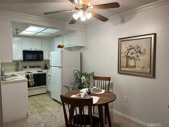 Independent Senior Living awaits you in this first floor unit with a private location. The living room and dining area have new carpeting, fresh paint, and crown moulding, with a slider to the private patio. The kitchen has white wood cabinetry with quartz counters, a smooth top electric range, new dishwasher, a microwave and refrigerator The kitchen also has a full pantry for extra storage. The bedroom also has crown moulding and a large mirrored slider closet with convenient shelving. The bathroom has a tub/shower combination. The community laundry room with washer and dryer is short steps away with a folding table and hanging rack. One can enter from the front door, or either of the doors from the gated parking area. Water, and trash are included amenities. The community HOA has recently repainted the interior and installed new flooring. Features include a seating foyer entry, community room with fireplace, lending library, puzzle table and multiple seating areas. There is also a kitchen area. Mailboxes are located in the lobby. Guests can call from the front door with the intercom system. One deeded parking space is located conveniently inside the gate. All of this is just a short distance from Five Points Shopping Center with Trader Joes, a bank, restaurants, and a wide variety of shopping. Special note, this property is on a land lease that expires in 2035.