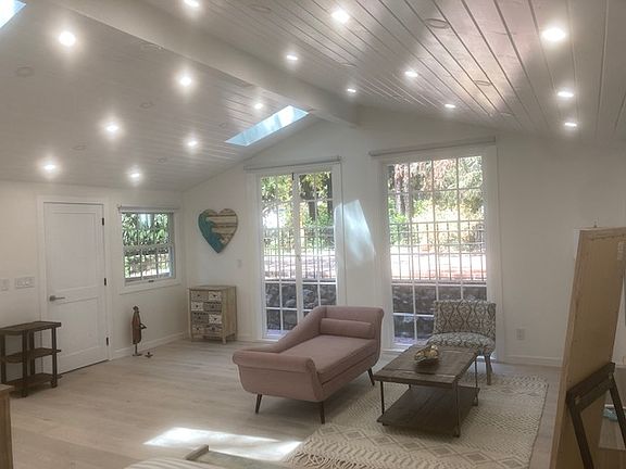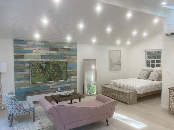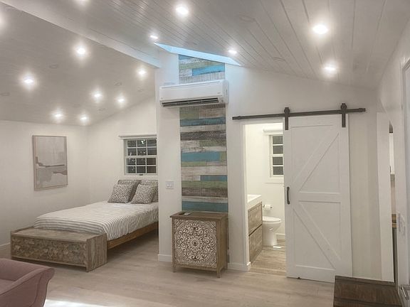 Features include: Fully furnished (or unfurnished) designer loft cottage, fully gated property, new hardwood floors throughout, new kitchen with new stainless steel appliances, breakfast sitting nug surrounded by windows, 12ft vaulted ceilings, LED lighting & dimmers throughout, state of the art "The Frame" Samsung 64" smart TV, accent walls throughout, new bathroom with bathtub, white remote-controlled roller blackout shades on all windows, Skylights, heating & AC system, 2 outdoor seating areas with brick patios, manicured landscaping, brand new washer & dryer in unit, outdoor shed for storage.