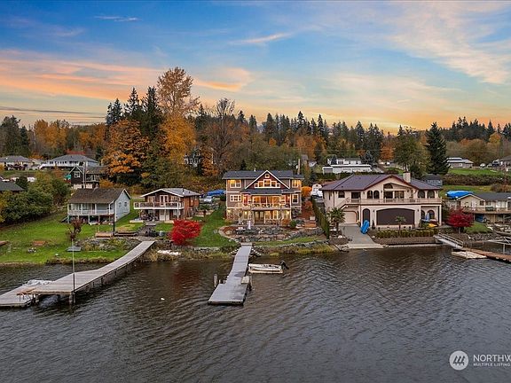 Lake living with a playground in your front yard! Beautiful custom home is 3 levels w/ a detached garage. Entry features covered slate porch & a 4-ft wide front door; cross the Great Room to the view of Big Lake through the 16 ft wide sliding doors. Gourmet Kitchen features Wolf range & Miele coffee system, marble countertops, and exotic Tigerwood hardwoods! Mud room has lots of towel storage & a dog wash. Upper level features primary bedroom with soaking tub & spa-like shower, a couple of closets, & 2 other bedrooms - don’t miss the lofts -with a jack-&-jill bathroom. Downstairs is a guests’ sanctuary. Lakeside is a patio, hot tub, 85’ dock and small boat / jet ski float. Outdoor storage room right next to the outdoor shower.