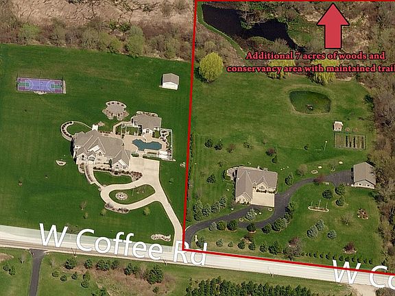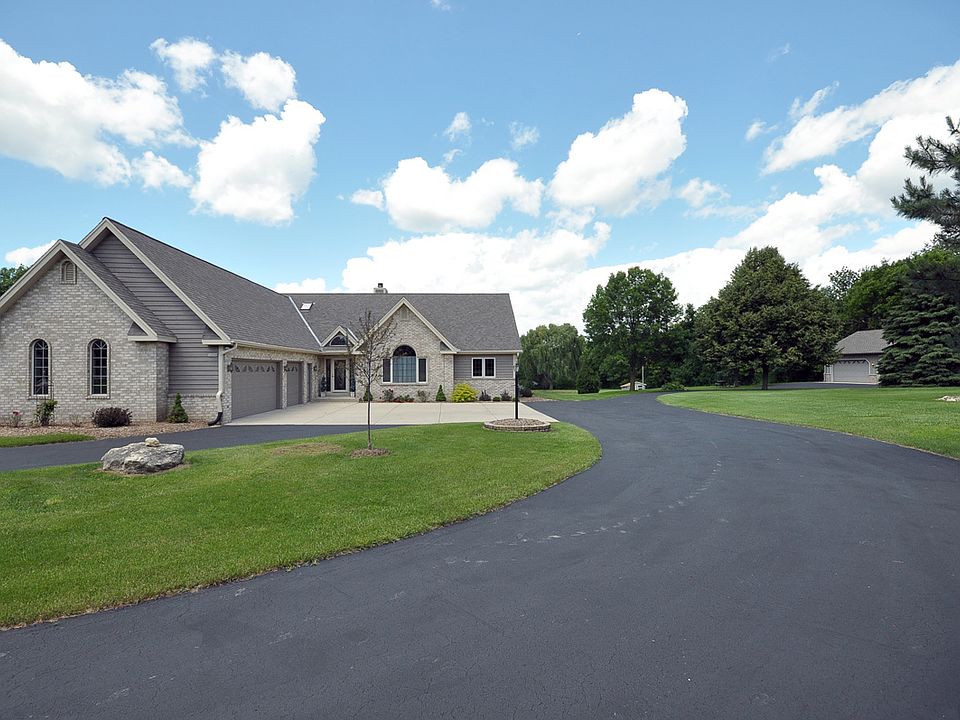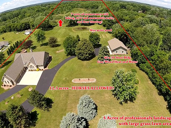 Great opportunity to own a one of a kind property in New Berlin! Beautiful Custom home situated on a private 12 acre lot. Seven acres of partially wooded conservancy including well-maintained trails and bridges for walking, ATV and snowmobile riding, and bow hunting. Five acre lawn has been recently updated with beautiful professionally designed landscaping and a man-made pond. In addition to this wonderful lot resides an additional 30 by 40 detached steel building / 4 car garage with electrical, gas/wood heat, and water. Perfect for the outdoor enthusiast! Enjoy the scenery and wildlife from a newer wrap around 1100 square foot composite deck complete with screened gazebo. The deck has 3 entrances: kitchen, great room, and master bedroom. Enter foyer to open great room with skylights and large wall of windows overlooking the beautiful backyard and wildlife area. Open concept great room, kitchen and dining area with cathedral ceilings. Master suite is generous in size with cathedral ceiling, walk in closet, large master bathroom and entrance to deck. Recently, the lower level has been professionally updated with a finished living area, perfect for entertaining with an additional kitchen. This area could easily be turned into a mother-in-law suite. In addition, the unfinished portion has built in hanging storage and large open areas. Plenty of room to expand! The house has skylights, cathedral ceilings and tons of storage throughout. Freshly stained exterior and painted interiors, brand new water heater, and a newer Iron Curtain water filtration system. Move in Ready!