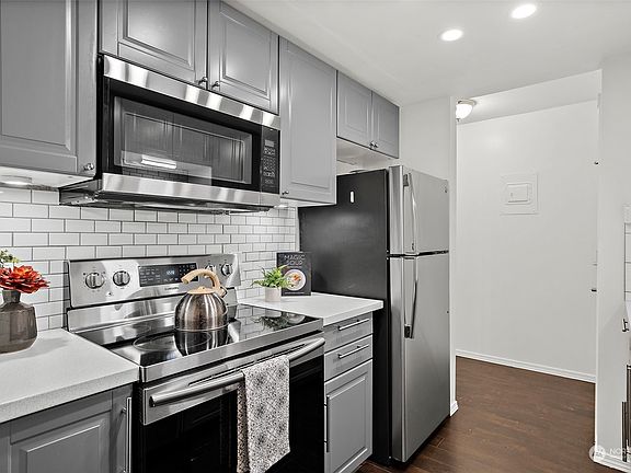 Step into this stunning 2 bed, 2 bath, 2 parking condo in the sought-after Richmond Beach neighborhood! Beautifully updated with a modern kitchen featuring stainless steel appliances, custom cabinetry, engineered floors and fresh paint throughout. The spacious primary offers a private ensuite bath. Unwind on the covered patio, ideal for year-round grilling or a morning coffee. This prime corner unit is next to the pool and includes storage on the patio and down the hall. Next to QFC, Starbucks, Hillwood Park's fields and tennis/pickleball courts. Just 5 mins to Richmond Beach and the 185th St Light Rail Station. Short drive to Edmonds, Lake Ballinger. Pet-friendly, no rental cap, high-scoring schools - welcome home!