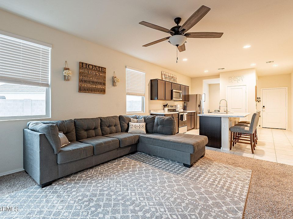Seller offering $8000 in closing costs, 1 year free home warranty with a full price offer! Ask the listing agent for details! Don't miss out on this beautifully maintained, 3 bed, 2 bath home built in 2020! This home sits on one of the largest lots in the community and nestled into a corner across from the Community Park! The kitchen boasts stainless steel appliances, espresso colored cabinetry and a ton of counter space. Gather your family at the breakfast bar for a bite to eat or for a more formal meal at the dining table! Large windows provide plenty of natural light throughout the whole home. Tile sweeps through the kitchen and bathrooms, while carpet warms up the living room and bedrooms. Step outside your sliding glass door and onto your covered patio. Kick back and relax while enjoying the quiet community and natural beauty of your surroundings! Watch your family and pets run around your oversized backyard. Low maintenance, desert landscaping provides beautiful scenery in both your front and backyard! Don't wait, this home won't last long!