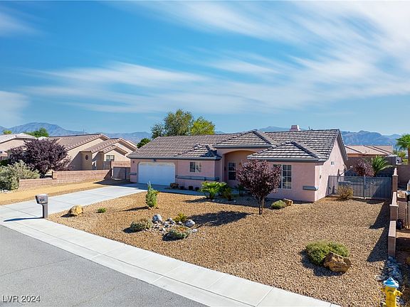 Charming 1,536 sq. ft. 3-bed, 2-bath custom home in the desirable Vineyards of Pahrump, NV, situated on a .19-acre lot with no HOA. This home offers public water and sewer, mature landscaping, and RV parking. The kitchen features granite countertops and tile flooring, while blinds and ceiling fans are found throughout. Enjoy a private backyard with a covered patio, rock landscaping, and a shed for extra storage. Perfect for comfortable living with space for your RV and more!