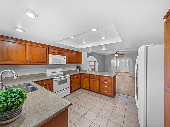 The kitchen is designed with functionality in mind, offering granite countertops, a stainless steel sink, updated cabinets with modern hardware, and plenty of counter space for all your culinary adventures. At one end of the home, you'll find an addition with a corridor leading to the private primary suite. This suite boasts a dream walk-in closet with custom organization and a primary bathroom featuring an oversized walk-in shower, a large jetted soaker tub, additional linen storage, and a dual sink vanity.