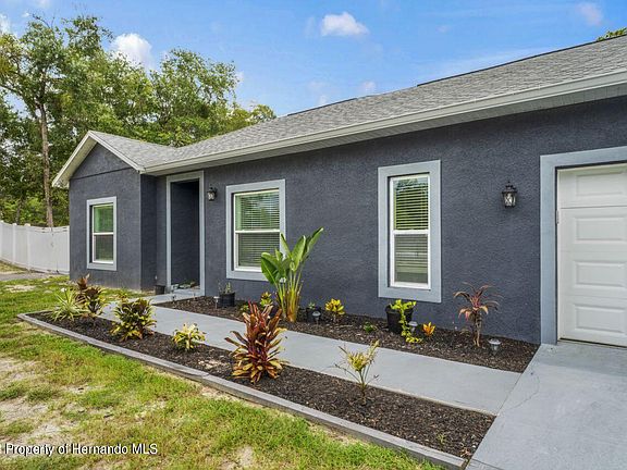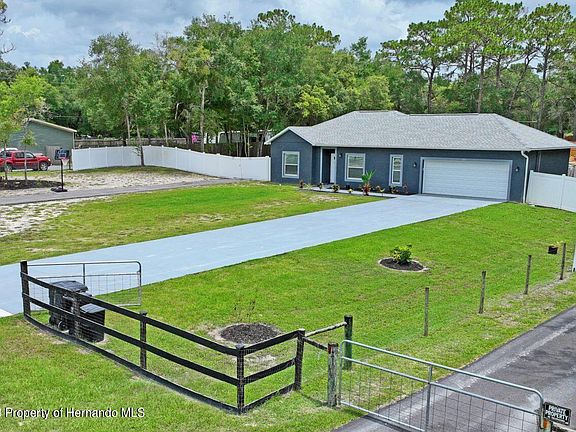 Active Under Contract. Accepting Back-ups.... Looking to start a family or have a growing family? Then this is the home for you! Newly built 2021 home located on 1 acre of land with an above ground pool and deck. This home features a split floorplan with 3bedrooms, 2bathrooms, and an oversized 2car garage with epoxy flooring and attic access. The garage door opener has a built in camera system that can be access through a mobile app. The mobile app will also give access to open and close the garage remotely. Inside of the home features recessed lighting throughout, Five 8'' Acoustic Audio 3way Home Theater System installed in the living room, dining and Kitchen ceiling, which gives that full surround sound affect. Granite countertops installed in the kitchen and both bathrooms, tile backsplash also installed in the kitchen, around the island and bathroom showers. All appliances are Samsung brand, except the refrigerator is Whirlpool. The dishwasher can be accessed by a mobile app as well to turn on or off the system when needed. The Master bedroom has a private water room with tiled shower, dual sinks and a walk-in closet. The other 2 bedrooms and bathroom are located on the opposite side of the home. This property is fully fenced in with 2 separate entrances and double-gates, Security Cameras and Security/Flood lights installed throughout the perimeter of the home. Looking for a private She-Shed or Mancave or Office space? Look no further! There is a 12x14 shed with a 3ft sitting porch that is waiting for you! It has been currently converted into a playhouse and has electricity, a ceiling fan, laminate flooring and LED lighting inside. This home also features an above ground pool with deck and child safety locking gate and an additional 12x16 shed for lawn equipment. This home is located with-in minutes from the Suncoast Parkway. The Suncoast Bike Trail Entrance can be accessed from Bowman Rd and is a very short distance from the home. This is a MUST SEE!!! Call today to schedule your private showing!