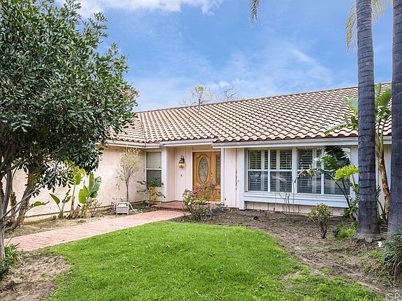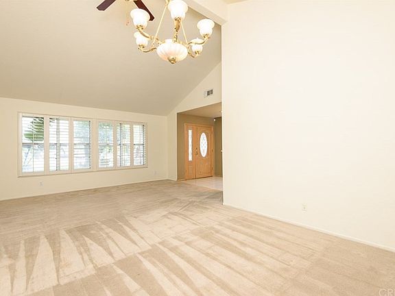 A brick lined walkway leads you through the beveled glass front door to an inviting tiled floor entry, living room with neutral carpet, high ceilings, wood shutters, smooth ceilings, and a formal dining area. The family room with skylight has a fireplace, sliders to rear grounds and is adjacent to the bright kitchen with tile floors and counters, and a big open window overlooking the pool area. Arched hallways lead to two secondary bedrooms with carpet, smooth ceilings, and blinds. A double door opens up to a large master bedroom with walk-in closet, slider to rear grounds, private master bath, tile floors, spa style tub, and a skylight. A tile roof, 2-car garage with direct access, an indoor laundry room, and a pool and spa are other highlights of this great ready to move-in home.