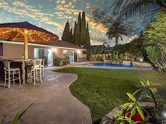 NOTHING LIKE IT ON THE MARKET!! 5 bedroom, 3 bathroom BEAUTIFUL SINGLE-STORY HOME! This home sits on one of the largest lots on the market, providing great space for the tropical paradise backyard that has a rock pool & spa with babbling water falls, encompassed by plumeria and other colorful, lush landscaping. Don't miss the cozy conversation fire pit tucked away behind the pool, which many s'mores have been enjoyed around! That's most definitely not all.. The Palapa Bar and BBQ area is always a favorite gathering spot for the adults. There's even room to add a tiny house or pool house structure if you wanted to! Now for the highly upgraded home designed with vaulted ceilings and an atrium court in the center... Very large updated kitchen with abundant storage, double oven, six burner gas stovetop and adjacent dining. Remodeled master bath with new wood grain tile flooring, new light fixture, new cabinet with quartz countertop, plus more! The large master suite offers a walk-in closet and direct access to the pool & spa. In the master suite wing of the home there are 2 other large secondary bedrooms. There are 2 living rooms, each with their own fireplaces. The front living room has an attached wing with its own bathroom, office/den and bedroom with a private entrance and patio - great for in-law quarters or separate living. Throughout the home, you'll find dual-pane Milgard windows, plantation shutters, custom paint and so much more. Award winning schools and freeway close.