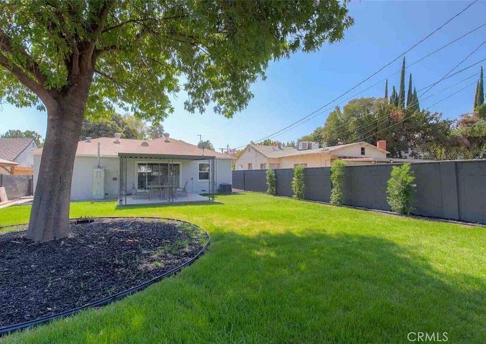 Natural light floods the interior through large windows and a glass sliding door, offering picturesque views of the beautifully landscaped backyard. The cozy patio and spacious, enclosed yard are perfect for outdoor gatherings or relaxing in privacy.