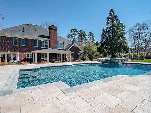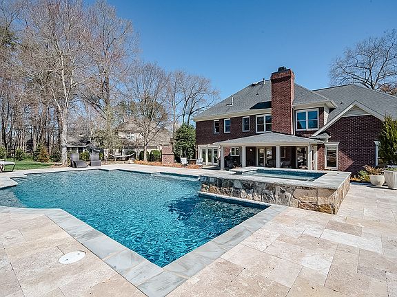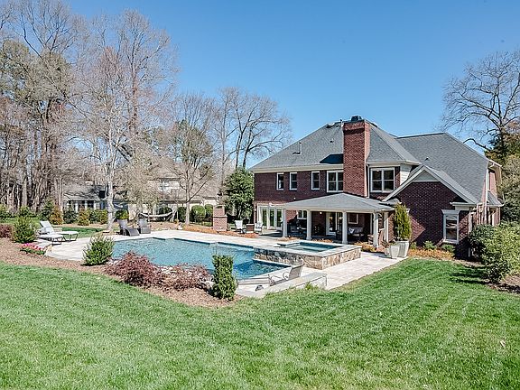 Imagine your day beginning with coffee on a private covered porch or relaxing at the end of the day in the heated jacuzzi overlooking expansive golf course views of uninterrupted sunsets. Set in idyllic Davidson, NC, this spacious brick and cul-de-sac home has a spectacularly designed floor plan. Indulge in spa relaxation in the main level owner's suite, master bathroom beautifully updated in neutral colors and tile accents. Your suite and great room open up to a new custom heated salt water lap pool with LED lighting and waterfall features. Pool, porch and patio are connected using natural flagstone, fieldstone and travertine with an outdoor fireplace enhancing entertainment and easy access to a newly remodeled kitchen. Landscaped professionally to enjoy year-round color and interest, the backyard is a resort oasis. The foyer boasts 20 foot picture frame moulding creating an elegant entry to a home decorated impeccably with designer lighting and classic paint and wallpapers.