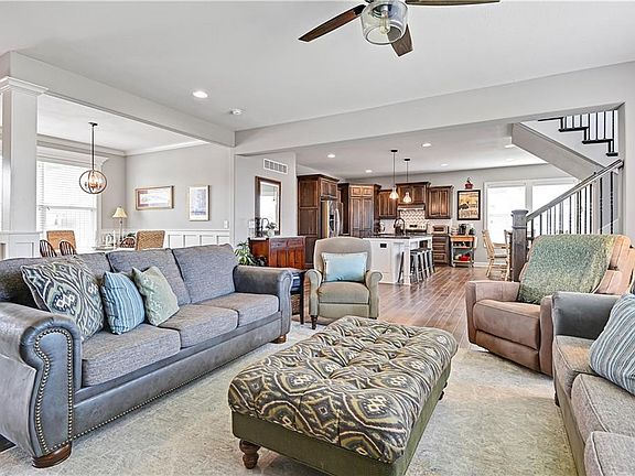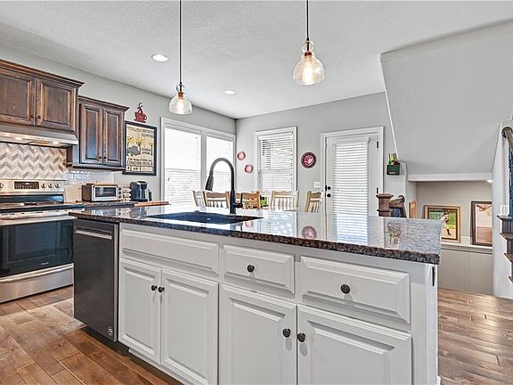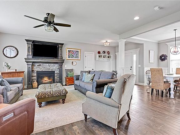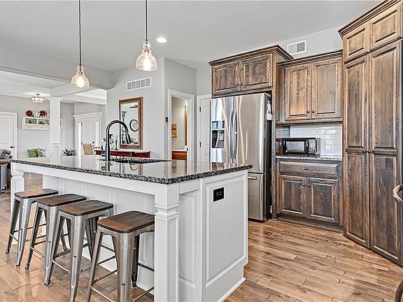 Lovely craftsman 2 story home in coveted Heather Ridge subdivision. Built in 2016, this home offers the perks of a new build but with so many upgrades. Gorgeous hardwoods throughout main level + sun-filled, open floor plan. Kitchen features granite counters, large island, high-end stainless steel appliances, and walk-in pantry. Plenty of area to host gatherings with a dining space and bonus eat-in kitchen. Newly built covered patio features a privacy screen and looks out to amazing view out back to the community green space & pool (no neighbors behind you!). Master suite features spacious room with bonus walk-in closet, bathroom with soaker tub, double vanity, shower & large second walk-in closet. Second bedroom features en-suite full bath and two additional bedrooms share a Jack & Jill bathroom. Enjoy the finished lower level that features a kitchenette, large bathroom, bedroom + 2nd laundry in bedroom closet. 3 car garage with loads of storage. Located in the sought-after South Olathe school district and steps from Madison Place Elementary school. It's perfect -- just move in and love your space! Perfectly situated in a peaceful culdesac setting with community green space, walking trails, park, & pool.