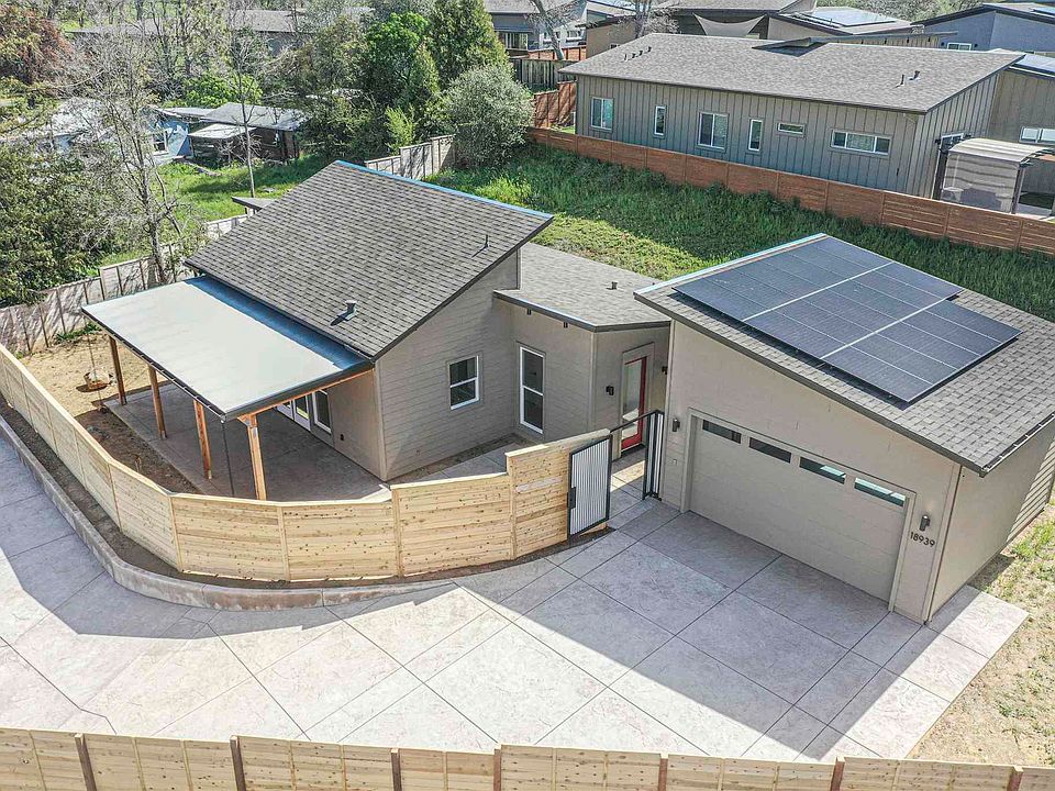 New Construction in Boulders Gated Community. Two bedrooms with extra room for dining table, or workout space or office. Inside Laundry, Open Kitchen to family room, Two full bathrooms. High ceilings and lots of light. This property offers upgrade of $7500 for covered wood constructed covered pati. Stamped concrete patio and driveway. Fully fenced and ready to move in. Two car detached garage with electric plug in. Solar included in sale. Split Unit for AC and Heat. LED lighting. Blown in Inslulation. Very Open and Bright.