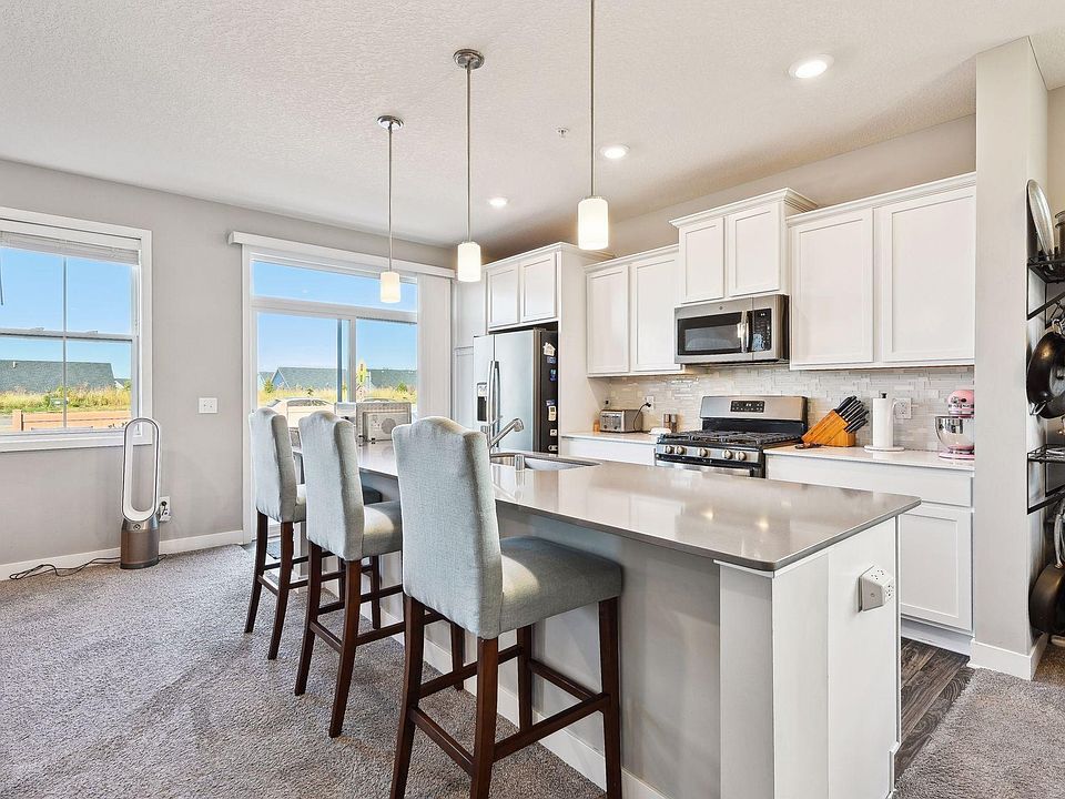 Welcome to this stunning, like-new home in the recently built Rush Creek Commons neighborhood! Step into the bright 2-story foyer and enjoy the open-concept main level, featuring quartz countertops, a decorative backsplash, slate appliances, and a large center island—perfect for cooking and gathering. The deck off the kitchen is ideal for outdoor relaxation. Upstairs, you'll find 3 bedrooms, including a spacious primary suite with a walk-in closet and private bath, plus the convenience of upper-level laundry. The finished lower level includes a 4th bedroom, bathroom, and a rec room, offering even more space to enjoy. With easy access to the Twin Cities, MSP Airport, Elm Creek Park Reserve, Rush Creek Golf Course, and The Shoppes at Arbor Lakes, this well-maintained townhome combines modern living with unbeatable convenience. It's the perfect place for those who value both comfort and location!
