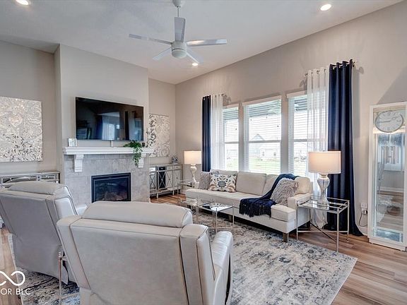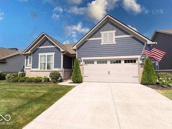 Welcome to this meticulously cared-for home with a bright, open-concept layout showcasing 11' raised ceilings, a gourmet kitchen with stainless steel appliances, a gas range, an oversized center island with quartz countertops, and family organizer built-ins. The main floor offers three spacious bedrooms plus a finished basement with all of the extra storage space you could need OR use the space to add a 4th bedroom (existing egress window!). Enjoy outdoor living with a front pond view or enjoy quiet evenings on the covered patio and park your vehicles in the spacious extra deep garage with room for all of your toys. This smart home is equipped with the latest technology, offering activation and support by Amazon and voice control by Alexa. Located in a golf-cart-friendly neighborhood, you can easily access the Pebble Brook Golf Course or explore nearby Morse Lake, shopping, and downtown Noblesville. Optional membership to Pebble Brook Club includes access to a 36-hole golf course, with exciting updates for 2024 such as a 4-6 bay golf simulator and a renovated restaurant and bar. This home combines luxury, convenience, and a prime location in the award-winning Noblesville School District. All of this AND an assumable loan at 2.65%!!