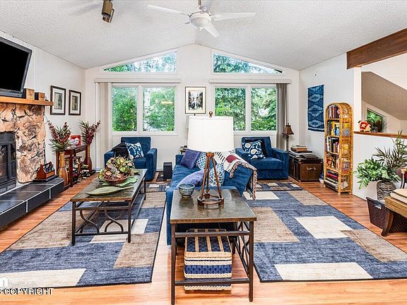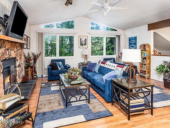Situated on a wooded private lot, this Eaglewood home has lots to offer. Highlight features include: 2 on-suite rooms (1 up & 1 down) with his/hers closets. A family room & living room both with a fireplace, spacious utility/laundry room and lots of storage space inside and out! Enjoy the open layout upstairs w/ vaulted ceilings & large S-facing windows. Easy commuting location to JBER and town.