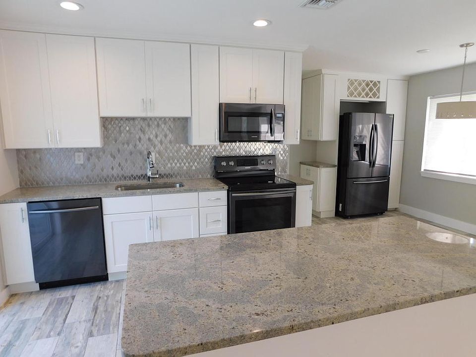 WOW REDONE POOL HOME, CONER LOT WITH AN COASTAL MODERN STYLE! This lovely home has many new features including: NEW roof, NEW A/C, NEW baseboard, NEW interior doors, NEW fans/light fixtures, NEW irrigation timer/pump, NEW sod, NEW electrical, NEW water heater, and much more. The grey washed tiled floors are perfect for the beach lifestyle! The gourmet kitchen has all new dark stainless steel appliances, granite countertop, modern backsplash, all wood white shaker cabinets with crown molding!Large kitchen island overlooking POOL! Both bathrooms have all new everything! Open floor plan concept with 4th bedroom/office separated with French doors. Large backyard is perfect for entertaining. POOL has spa with two small waterfalls! Bike path to A rated schools and walk to beach, beach acces