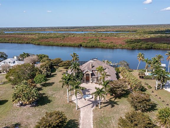 CUSTOM, ESTATE HOME ON THE BANKS OF THE PEACE RIVER SITUATED ON GATED 5+ ACRES - This breathtaking, two-story, 4 bed/3.5 bath + den, waterfront home HAS IT ALL including 227ft of river frontage! You will be impressed from the entrance that offers a wrought-iron, security gate w/keypad entry followed by a meandering, brick-paver drive that passes a private pond, 12-car (3,200 sqft) detached garage w/center pole lift and concludes at the 4,900+ sqft main residence that boasts an elegant stone facade w/attached 3-car garage. Step into a grand & welcoming foyer that opens to the formal living room. The formal living room boasts a 24ft ceiling, 2-way fireplace shared w/the dining room & a double set of French doors that provide views straight out to the lanai, pool & river beyond. A formal dining room & large den are also located just off the foyer. The spacious, family room also has 24ft ceilings & a fireplace plus a custom Cherry bar w/stained glass elements, stained glass transom windows & two sets of disappearing sliding glass doors that open out onto the lanai extending the living space outside offering views of the pool & river as well. A large breakfast room w/mitered bay window connects the living room, family room & kitchen. The chef's kitchen features granite counter tops, custom Cherry cabinetry, top-of-the-line stainless steel appliances including a Viking 6-burner gas range, Viking double built-in convection ovens plus warming drawer, Samsung refrigerator & a Miele dishwasher. The kitchen also offers a large center island w/multiple power receptacles, a breakfast bar plus ample cabinet & counter space. The private, master retreat boasts a large sitting room that opens to a grand master suite w/walk-out access to the lanai, a separate private patio & large master bath w/dual sinks, two large walk-in closets, tiled shower & private WC. Two guest rooms (one w/en-suite bath & private access to the lanai) complete the 1st floor. The 2nd floor offers the 4th bedroom w/en-suite bath & a loft w/balcony. The balcony has a spiral staircase leading to the widow's walk on top of the home. Panoramic river views can be found from this elevated perch. Outside, the awe-inspiring lanai awaits w/brick paver deck surrounding an in-ground, heated pool w/attached spa & picture frame pool cage. Pool evokes the feel of a private oasis w/stone waterfall & tropical planters. Follow the brick paver path to the expansive dock w/TWO BOAT LIFTS (30k & 20K). Water & electric (220 & 110v) hook-ups are available dockside. Start enjoying some of the best fishing & boating in SW Florida from your backyard. Other amenities include an interior kennel w/access to yard, large broom closet & walk-in storage room/security command center, whole-house dehumidifier, hurricane protection, 3 A/C systems (+1 more in detached garage), 2 new hot water heaters, whole-house R/O water filtration system. Updates & upgrades include 2nd boat lift, new roofs on house & detached garage (2020), variable speed pool pump, updated pool heater & new outdoor fans. Make an appointment today. You won't be disappointed.