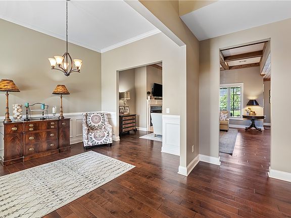 Stunning coffered and wood-accented ceilings with unique detailing in every room. Beautiful hardwood floors throughout the main level and staircase. Light-filled, open-concept living, breakfast, and kitchen areas, perfect for entertaining. Chef’s kitchen with real wood custom cabinetry, stainless steel appliances, gas cook top, and a built-in butler’s buffet. The primary suite is conveniently located on the main floor, with three additional bedrooms and two full baths upstairs—plenty of space for guests, family, or home offices. All bathrooms include matching real wood custom cabinets and thoughtful design. Generous storage throughout the entire home, including a walk-in floored attic, a true rare find!