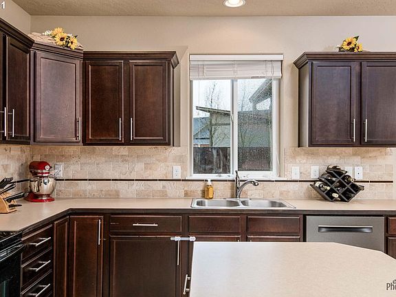 Main level is an open floor plan featuring a Living/Family Room area with a gas fireplace, a spacious dining area and a separate den. The Kitchen has beautiful cabinets and a full tile backsplash. Upstairs has the master suite with dual sinks, walk in shower and soaking tub. Fully fenced yard with covered patio and underground sprinklers. High efficient gas heat and electric central air conditioning.