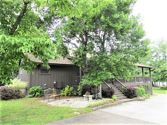 Waterfront home on deep-water cove just minutes to the "Big Water". Well maintained home, four bedrooms, two baths, open floor plan, hardwood floors, heart pine cathedral ceiling, gas log fireplace, light and bright sun room and covered porch overlooking lake. Full basement with extra storage, shelving, exercise and office area. Two car garage with workshop, storage building, two carports. Beautiful mature landscaping, in-ground sprinkler, dock with boat cover. New roof in 2017, HVAC in 2018.