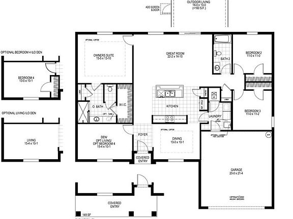 The SIESTA floor plan offers three bedrooms plus a den which can be converted into additional open living area or into a 4th bedroom, 2 full bathrooms and 2 car garage totaling 1864 of living space with 9'4" ceilings. An island kitchen design is open into the Great room, separate dining area, and split bedroom floorplan. Some options include a 10' x 16' lanai under truss, quartz/granite countertop selections, 42" upper kitchen cabinets, 2 front elevations, dual sinks in owners' bath, tile flooring, laundry room cabinets/tub, coffer ceilings to 10', interior/exterior paint colors.