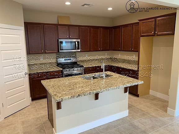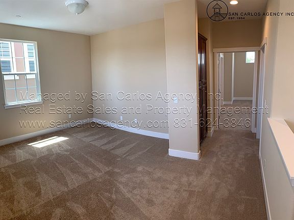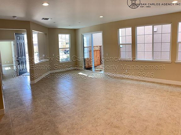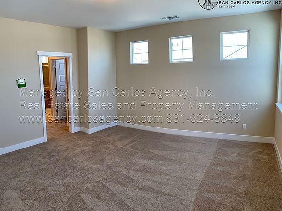 (FATIH) San Carlos Agency, Inc. offers this two story, three bed, three bath home located in the highly desirable East Garrison community halfway between Salinas and Monterey. This home boasts a mix of carpeting in the bedrooms and tile floors everywhere else. Downstairs has an open floor plan from the kitchen to the living room. The kitchen has beautiful countertops, lots of cabinet space and a large pantry. A spacious master bedroom, good size guest bedrooms and a two car garage complete this home. The laundry room has hookups for a washer and gas dryer (not provided). Window coverings and refrigerator have been installed. No smoking. Pet negotiable.