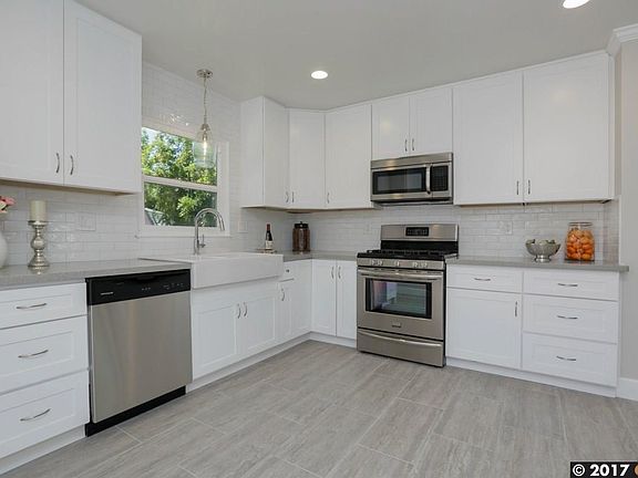 The 3 bedroom, 2 bathroom rancher boasts refinished, hardwood floors, crown molding, designer paint, and a stylish new kitchen with apron sink, stainless appliances, quartz counters with white subway tiles' backsplash, grey porcelain tile floor and a built-in seating bench. The master bedroom suite, includes an updated bathroom decorated in white subway tiles surrounding the tub, pedestal sink and stylish sliding "barn" door. The stunning, new hall bathroom has a shower designed with white subway tiles grouted in grey, inlaid tile accents and a glass door. Located down the block from Monte Gardens Elementary (not guaranteed for eligibility)